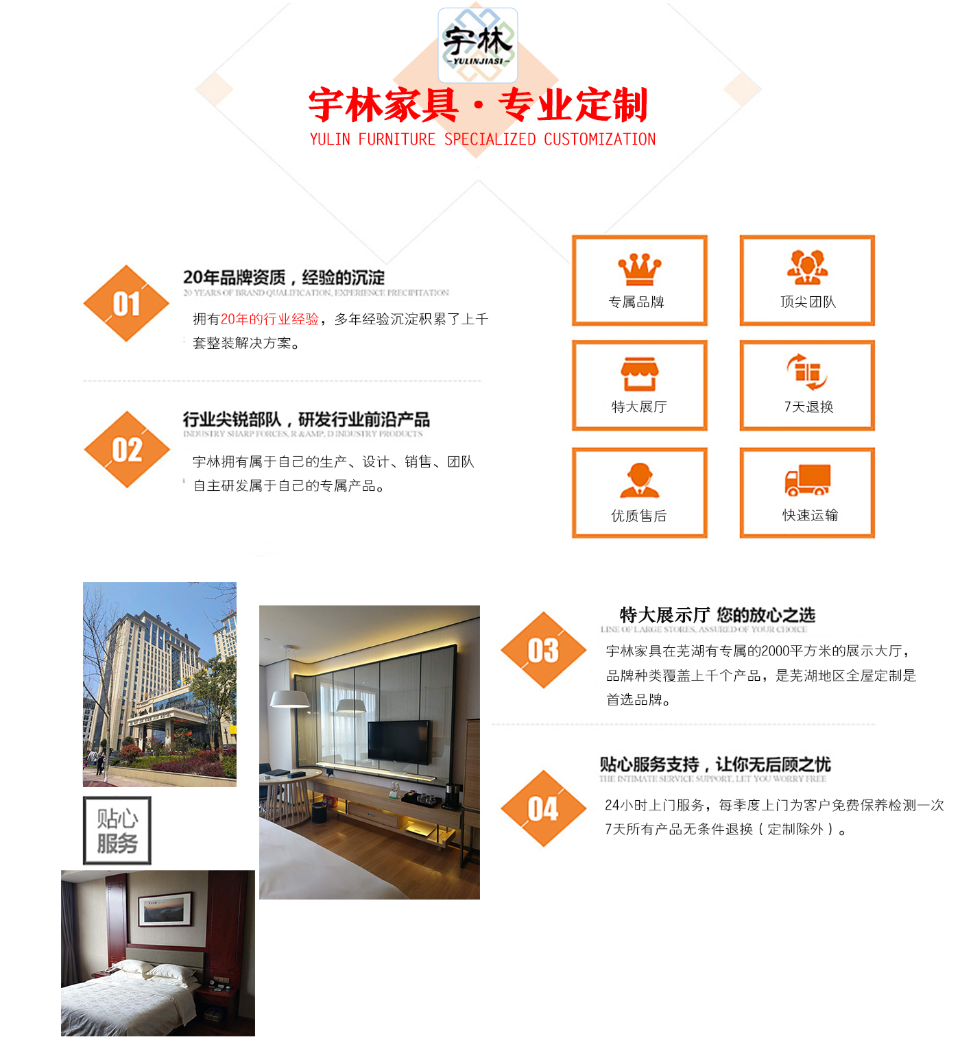 蕪湖宇林工貿(mào)有限公司創(chuàng)建于1996年,位于蕪湖高新技術開發(fā)區(qū)南區(qū),占地面積13000余平方米。是一個集研發(fā)、設計為一體的綜合性公司,公司主營整體家居定制、酒店家具定制、娛樂場所配套家具以及軟體系列,團隊,銳意革新、進去不息的理念,逐漸成為蕪湖家具行業(yè)的生產(chǎn)廠家,并在2006年注冊了“宇林”牌商標。宇林品牌家具依現(xiàn)代與古典相結合的多種實木家具、實木貼皮家具。家具做工精細,多用人工雕刻;其自然、典雅的風格在很大程度上引導著人...